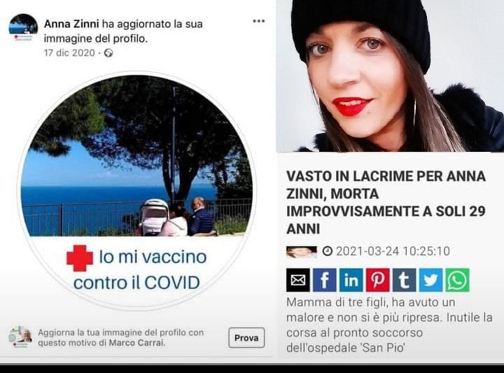11)- Bra (Como) Silvia Dellavalle infermiera 40 anni. L’infermiera, che aveva completato il ciclo vaccinale con la seconda dose, è stata probabilmente stroncata da un infarto, ma non è chiaro se provocato dal farmaco sperimentaleautorizzato da Ema ed Aifa con “condizionalità”, oppure per altre cause.