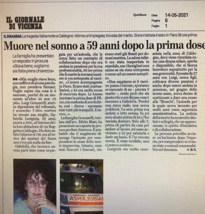 12)- Napoli: Annamaria Mantile, 62 anni, insegnante di inglese dell’istituto comprensivo Pavese, è deceduta pochi giorni dopo la somministrazione della prima dose del vaccino Covid. I familiari hanno presentato una denuncia ai carabinieri.