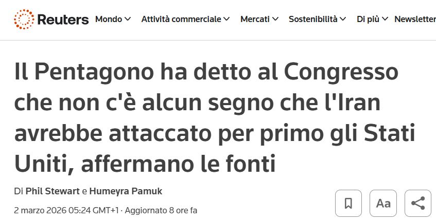 Posted on lunedì 2 Marzo 2026lunedì 2 Marzo 2026 By Grande inganno Nessun commento su Il Pentagono al Congresso: “nessuna prova che l’Iran stesse per attaccare gli USA per primo”.