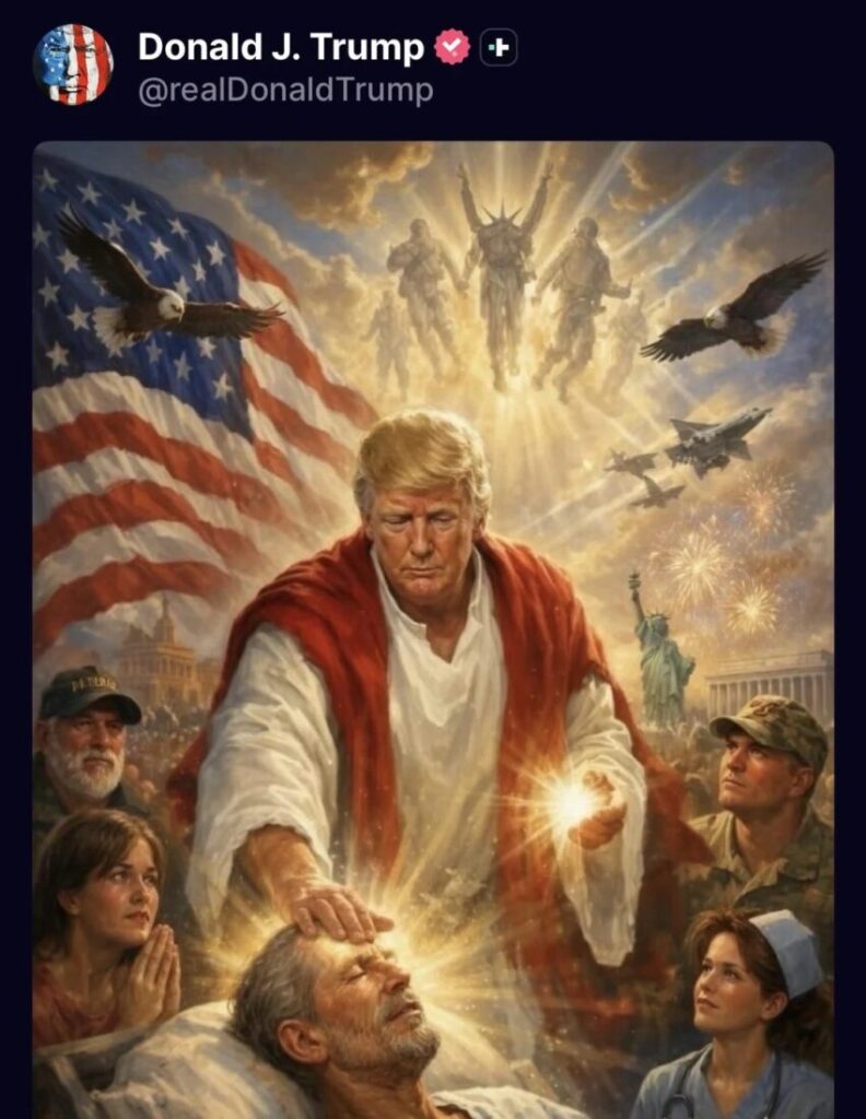 Donald Trump in pieno delirio di onnipotenza pubblica un’immagine generata con intelligenza artificiale in cui si raffigura come Gesù Cristo.